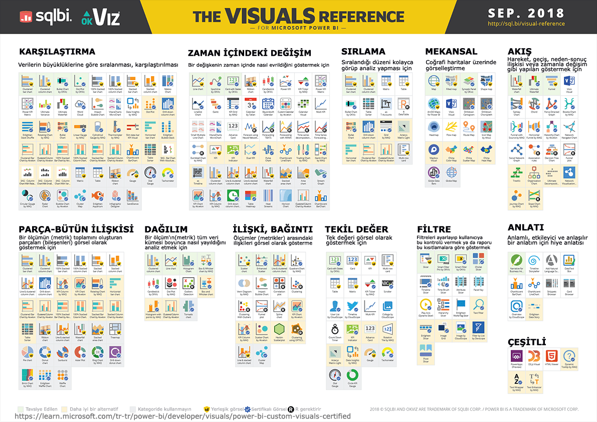 Alan grafikleri: Temel (Katmanlı) ve Yığılmış, Çubuk ve sütun grafikleri, Kartlar, Birleşik grafikler, Ayrıştırma ağacı, Halka grafikler, Huni grafikleri, Ölçer grafikleri, Ana etmenler grafiği, KPI'lar, Çizgi grafikler, Temel harita, ArcGIS haritası, Azure haritası, Kartogram (Koroplet), Şekil haritası, Matris, Pasta grafikler, Power Apps görseli, Soru-Cevap görseli, R betik görselleri, Şerit grafik, Dağılım, kabarcık ve noktalı çizim grafiği, Dağılım-yüksek yoğunluklu, Dilimleyiciler, Akıllı anlatı, Tek başına görüntüler, Tablolar, Ağaç haritaları, Şelale grafikler, custom grafiklerle ile en doğru şekide verilerinizi görselleştirmenizi öğreneceksiniz.